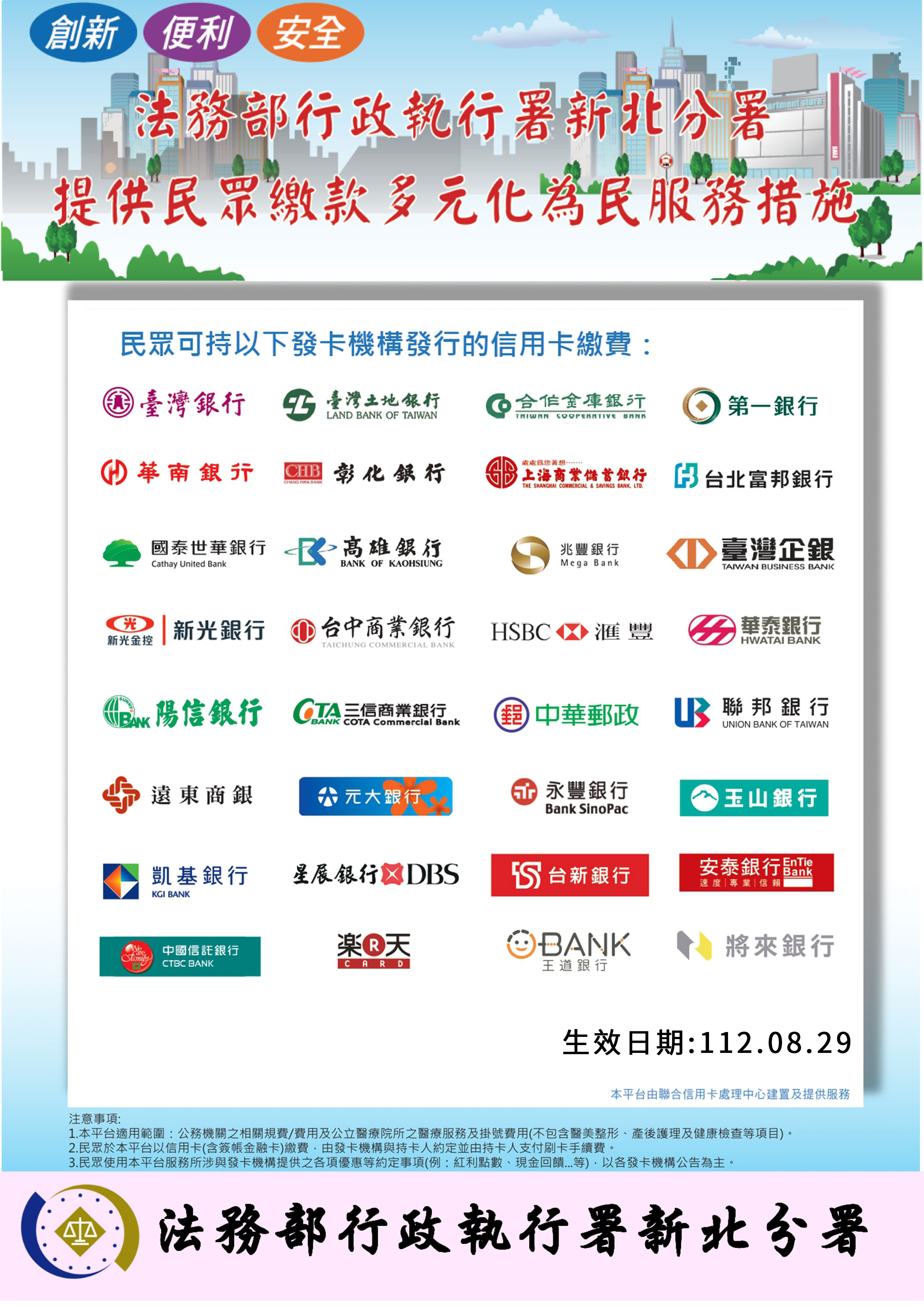 新北執行分署多元繳款新制,105年1月4日上路,義務人收到繳款通知, 不論金額多寡,都可以持32家發卡銀行之信用卡,至本分署辦理臨櫃刷卡繳納案款,只要多負擔2元至35元不等手續費,就可省去攜帶現金的不便或現金不足的困擾,請多加利用。