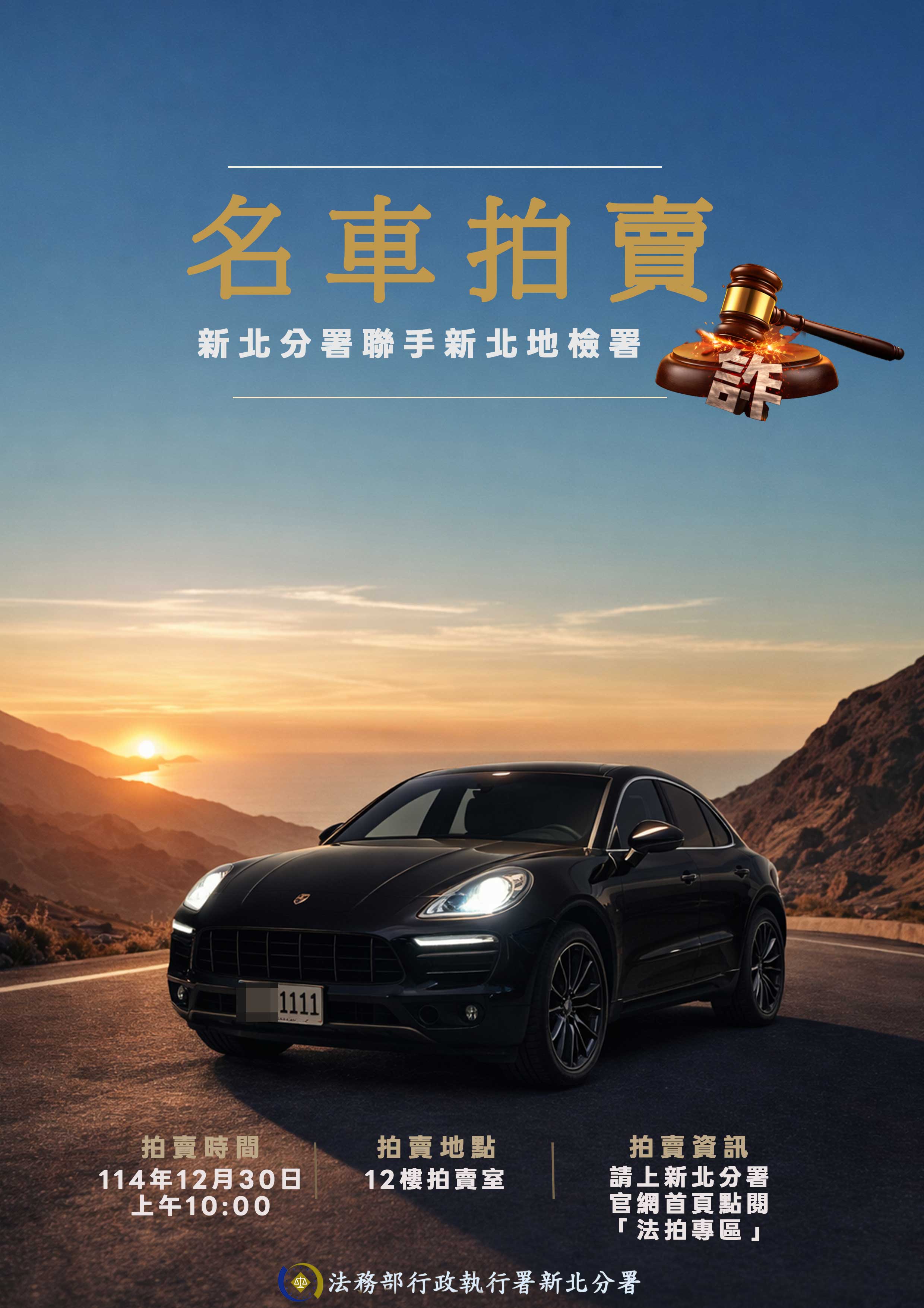 1141222新聞稿-新北分署拍賣詐欺犯嫌保時捷名車 12月30日上午公開競標